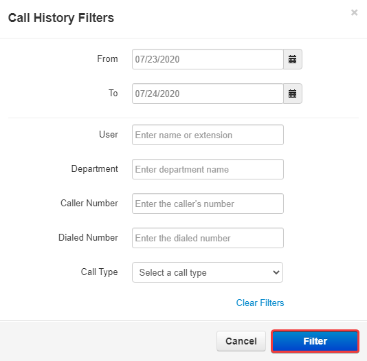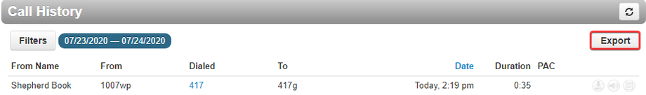 - Export - If you wish you may export the call history to a CSV file by clicking on the "Export" button